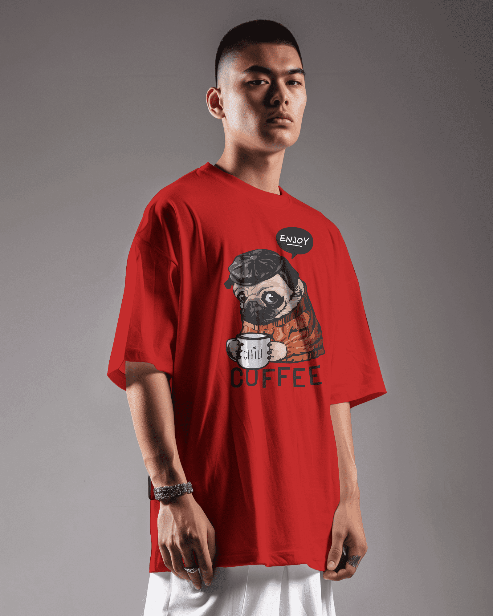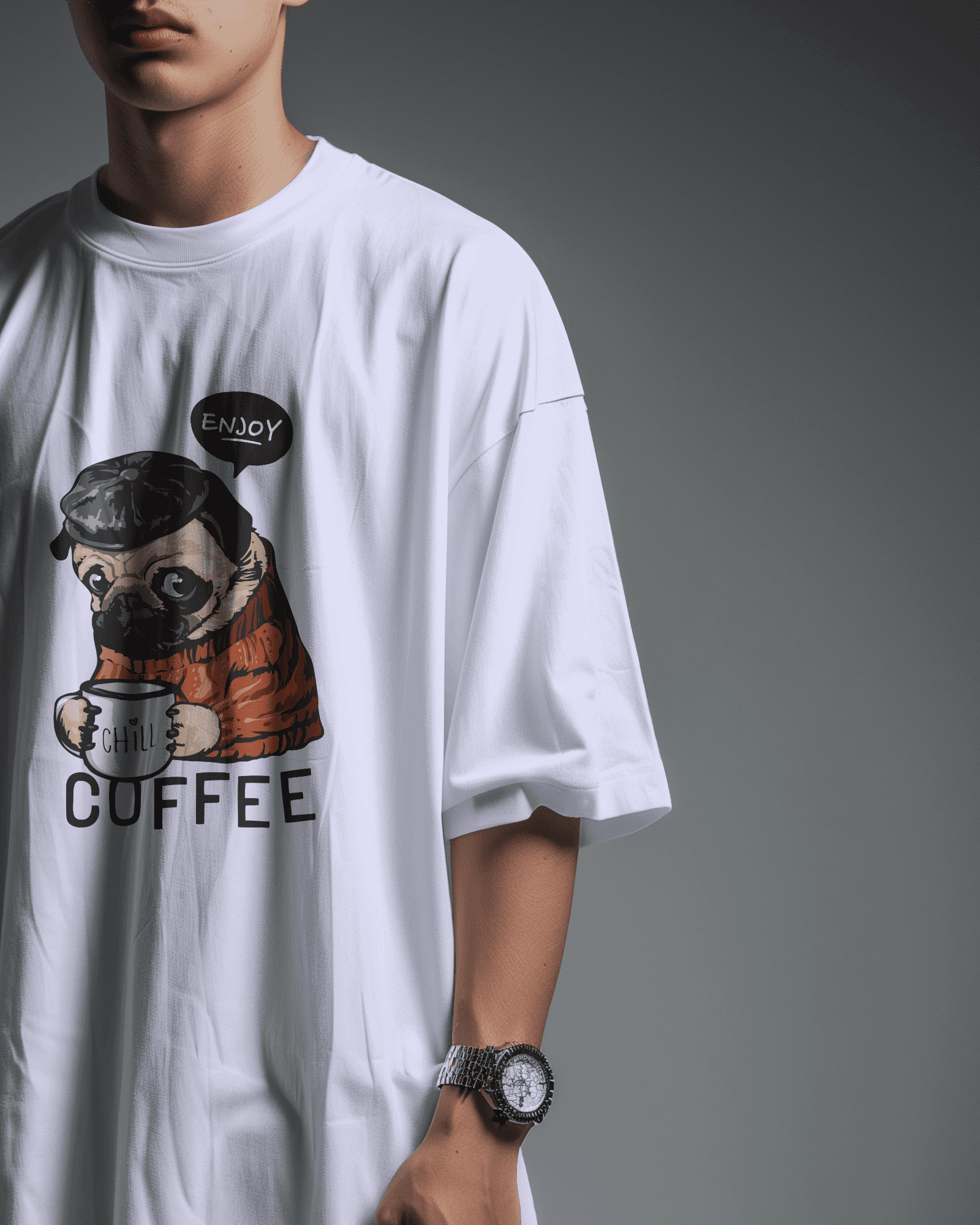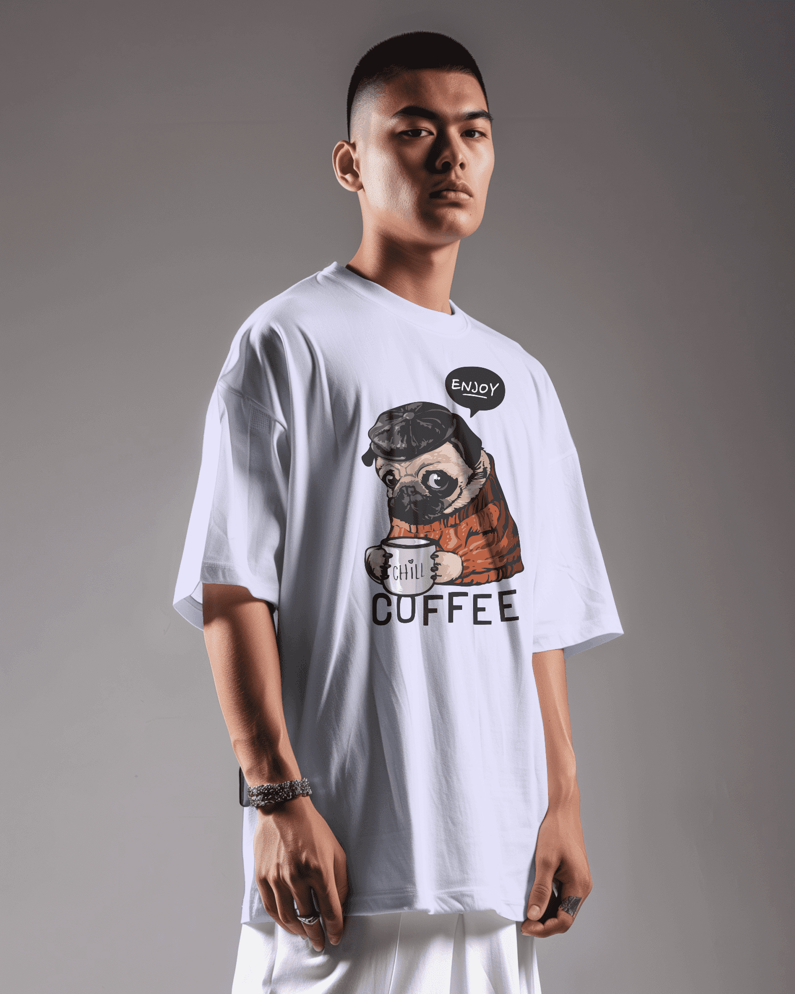 Pug with coffee Unisex oversized T-shirt